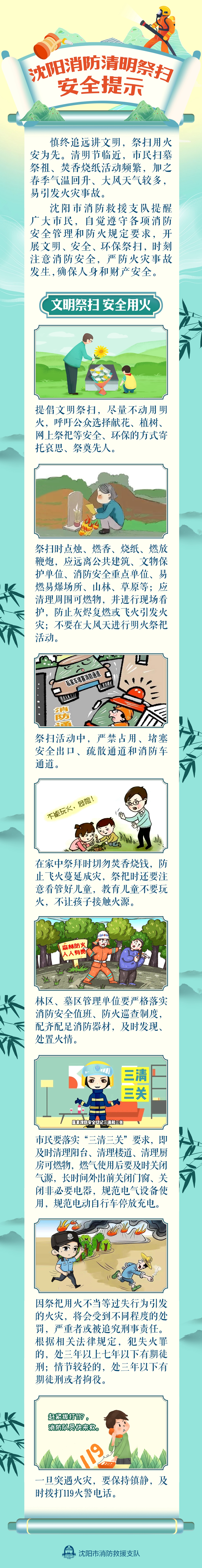 沈陽市消防救援支隊提醒廣大市民,自覺遵守各項消防安全管理和防火規定要求,開展文明、安全、環保祭掃,時刻注意消防安全,嚴防火災事故發生,確保人身和財產安全。