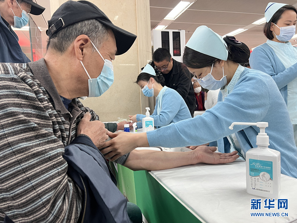 活動現場,沈陽市第四人民醫院護士為市民免費測量血壓。新華網 唐曉瑭攝