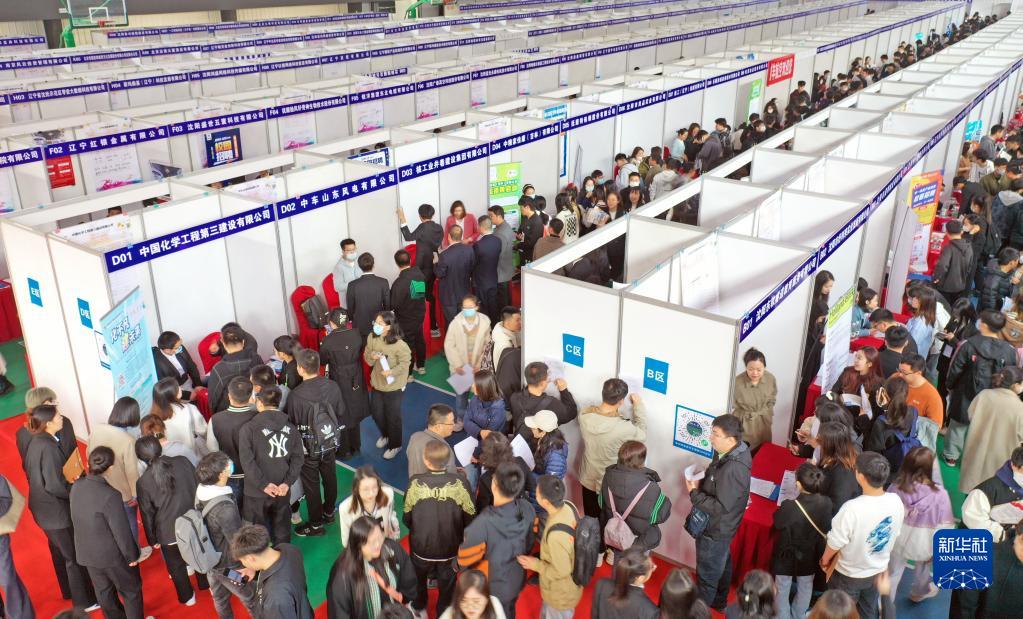 3月31日,在沈陽工學院體育館,學生們參加校園招聘會(無人機照片)。新華社記者 楊青 攝