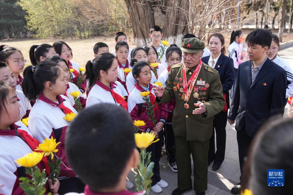 志愿軍老兵李維波在沈陽抗美援朝烈士陵園內為學生們講述戰爭經歷。新華社記者 潘昱龍 攝