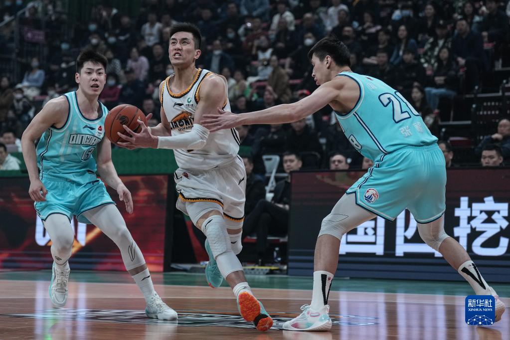 4月5日,遼寧本鋼隊球員郭艾倫(中)在比賽中帶球突破。新華社記者 潘昱龍 攝