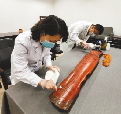 遼博工作人員正對九霄環佩琴進行保養,以確保下個月展覽順利進行。