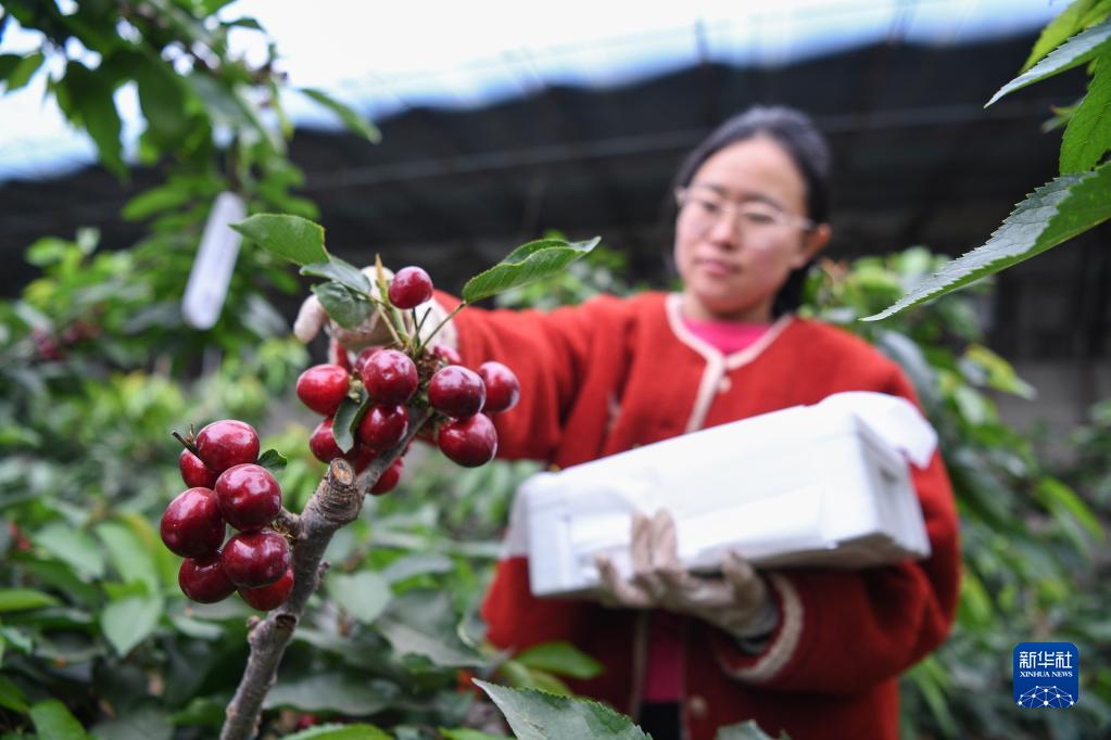 4月17日,大連市旅順口區三澗堡鎮曹家村村民在采摘大棚櫻桃。新華社記者 龍雷 攝