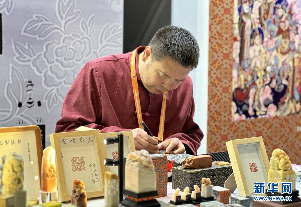 2023年大連市文化和旅游產業發展大會現場,非遺傳承人展示雕刻技藝。新華網趙健彤攝