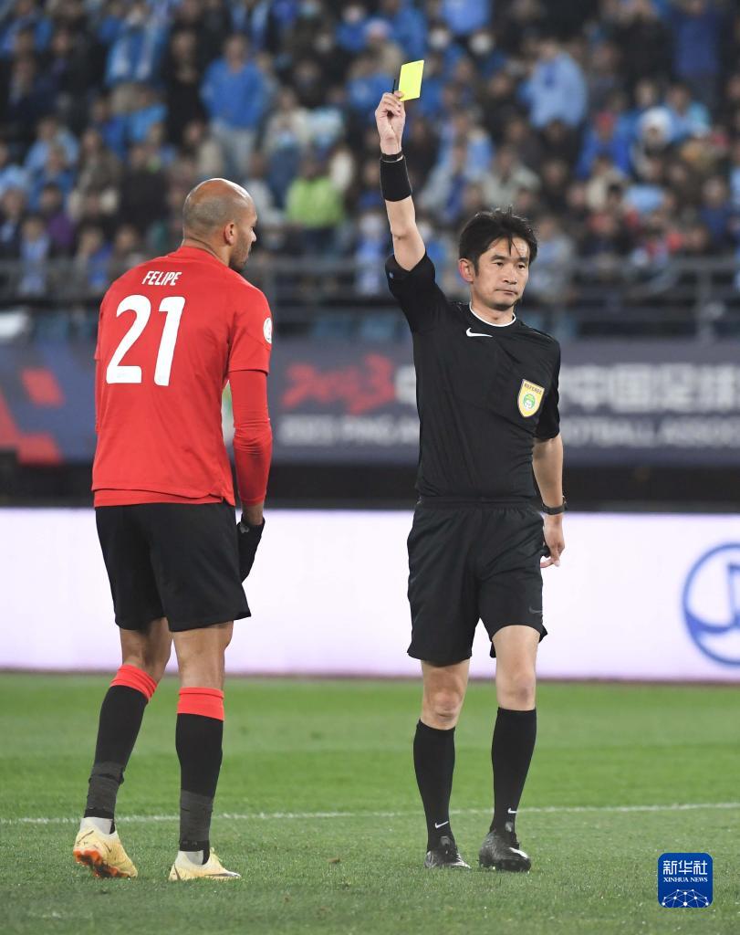 4月26日,裁判向成都蓉城球員費利佩(左)出示黃牌。新華社記者 龍雷 攝