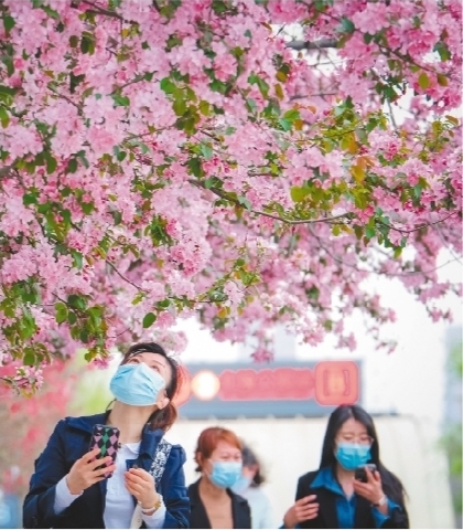 “五一”假期將至,沈陽市街區處處裝點一新,節日氛圍濃厚。春光爛漫,在皇姑區泰山路,海棠花開正好,引市民和游客駐足拍照留念。(記者 查金輝)