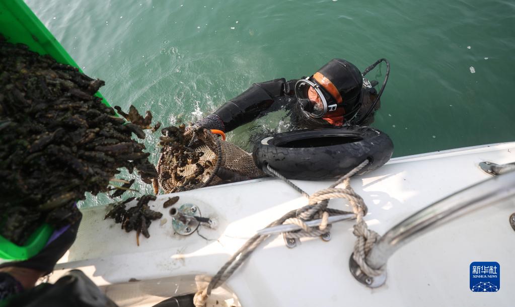 長??h廣鹿島鎮的漁民抓緊時間進行海產投苗作業,一片繁忙景象。