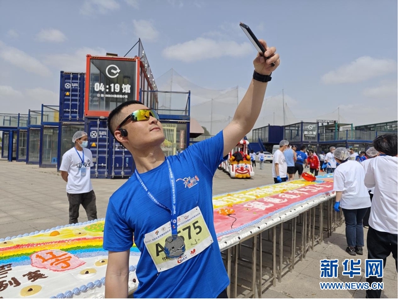 5月21日,參賽選手與超大蛋糕拍照留念。新華網 唐曉瑭攝