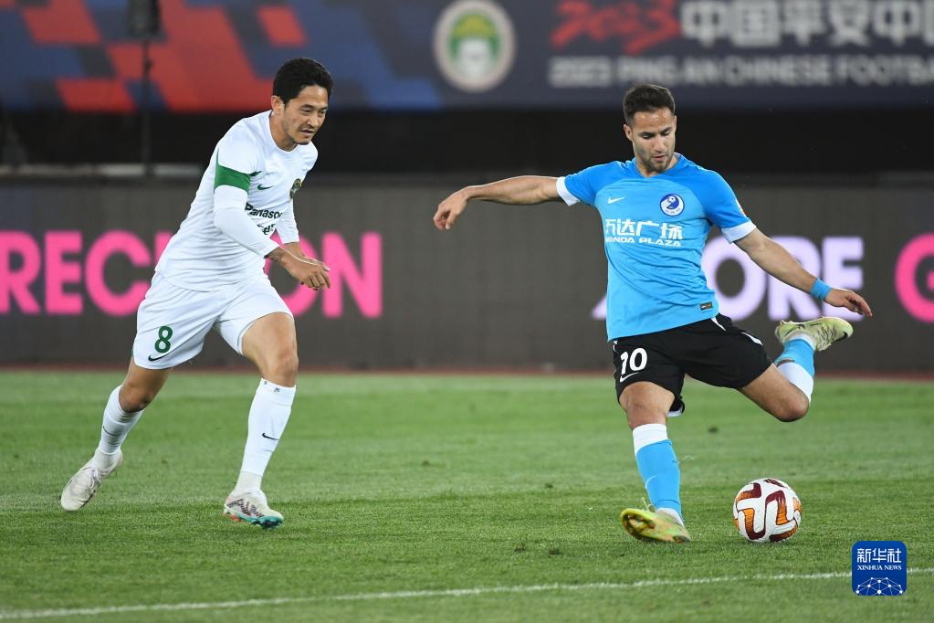 5月24日,大連人隊球員特索涅夫(右)在比賽中帶球進攻。新華社記者 陳為 攝