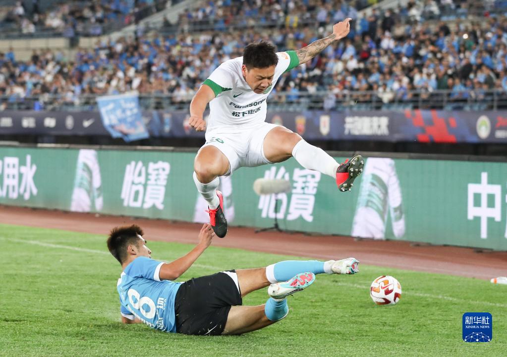 5月24日,浙江隊球員岳鑫(上)在比賽中帶球突破受阻。新華社記者 龍雷 攝