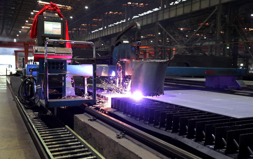 6月1日,中國船舶大連造船LNG運輸船第一塊鋼板正在切割。(中國船舶大連造船供圖)