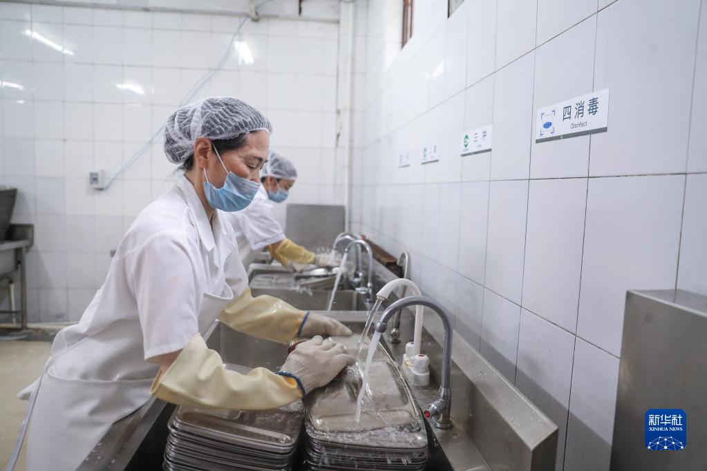6月1日,沈陽市第一二0中學食堂工作人員在按流程洗消餐具。新華社記者龍雷攝