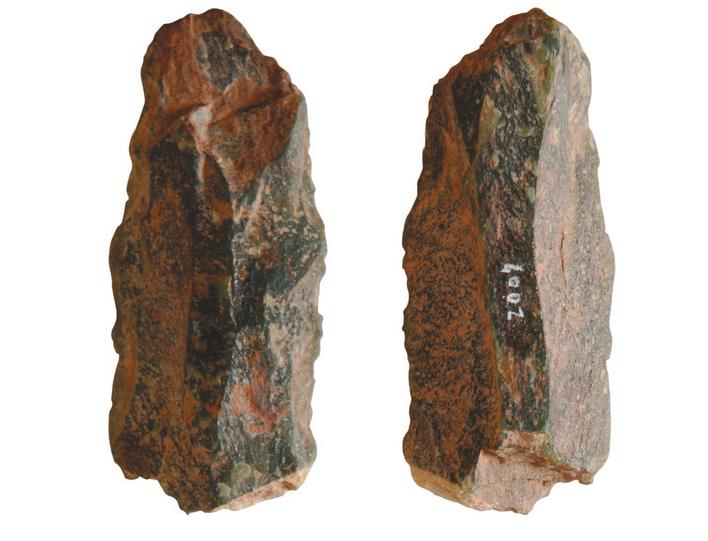 此外,讓傅仁義更加欣喜的是兩件出土于洞穴土層里的岫玉制品“這兩件出土文物將人類使用岫玉的時間直接提前到了舊石器時代?!彼f。這兩件岫玉石器一塊是兩邊被打砸得較為鋒利的刮削器,用來剝離動物獸皮,另外一塊是岫玉材質的打擊石片。