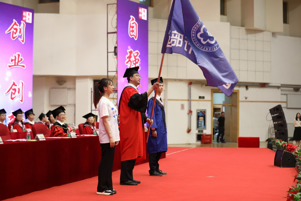 黨委書記郝德永為參加西部計劃的志愿者代表,美術與設計學院研究生畢業生韓放同學授旗。