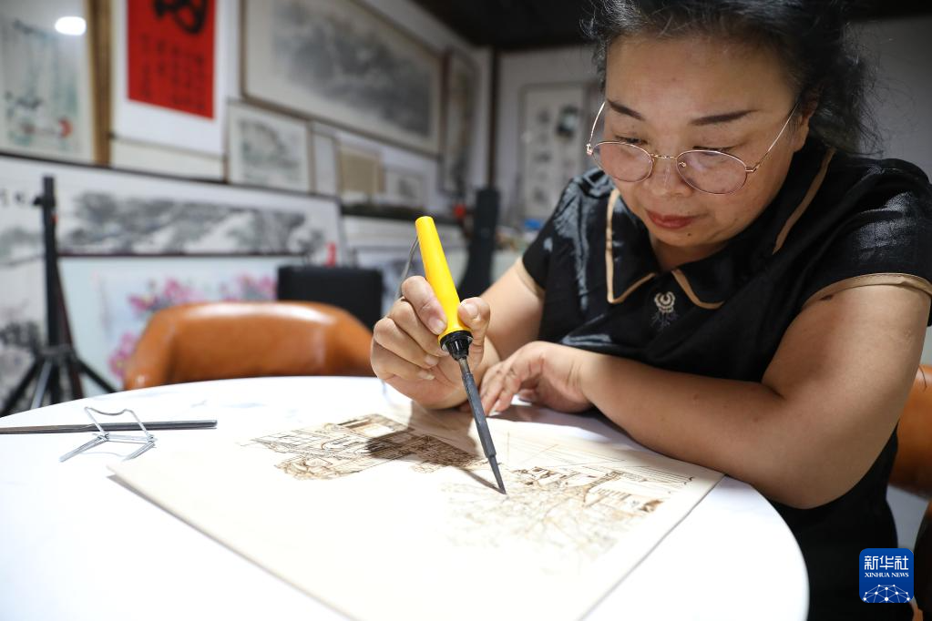 7月6日,李影在位于遼寧省營口市大石橋的工作室里進行木板烙畫創作。新華社記者 姚劍鋒 攝pagebreakpagebreak