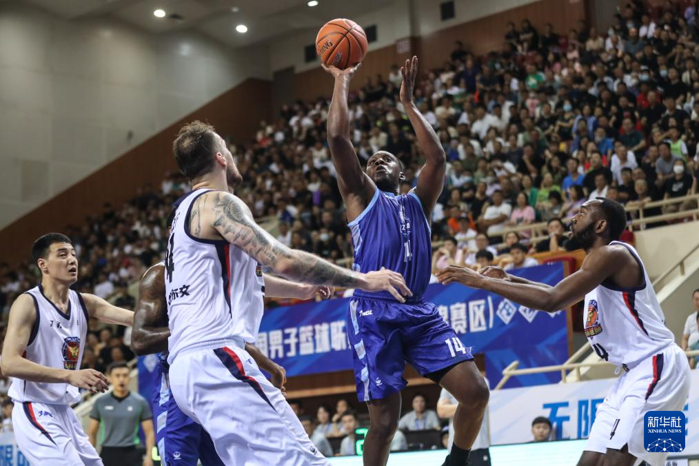 7月16日,遼寧益勝雪狼隊球員哈德森(右二)在比賽中投籃。新華社記者 潘昱龍 攝