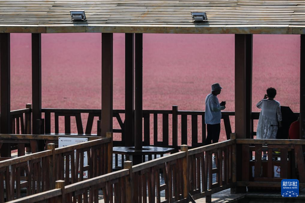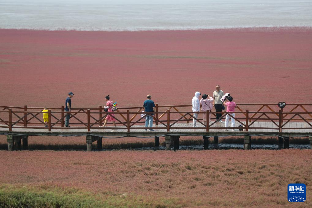 近日,遼寧盤錦紅海灘國家風景廊道內的堿蓬草迎來最佳觀賞期,紅灘綠葦,景色優美,吸引游客前來觀賞游玩。新華社記者 潘昱龍 攝