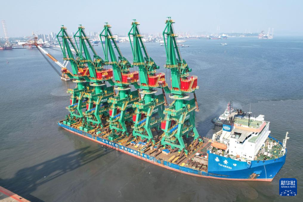 7月20日,大連重工裝備集團出口印尼的五臺大型門座順利發運。新華社發