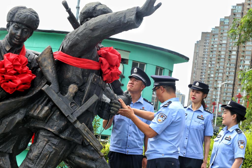 遼寧丹東邊境管理支隊振安邊境管理大隊與丹東港邊檢站民警瞻仰志愿軍雕塑。(遼寧丹東邊境管理支隊供圖)