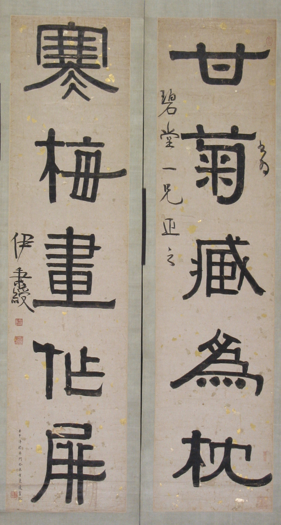 伊秉綬為篆隸中興先驅代表,此次展出其隸書五言聯“甘菊藏為枕,寒梅畫作屏”引人注目。王喆介紹,伊秉綬的隸書風格是在廣泛吸取漢代磚瓦銘文、隸書碑刻等基礎上形成的,在準確把握漢碑敦厚古樸藝術特點的同時,加入了個人理解,形成了“融顏入隸”的獨特風格,舒緩平淡又不失大氣雍容。(記者趙洪南)