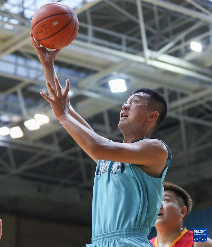 8月8日,彰武縣葦子溝鎮隊球員于純石在開幕式的籃球表演賽中上籃。新華社記者 龍雷 攝pagebreak