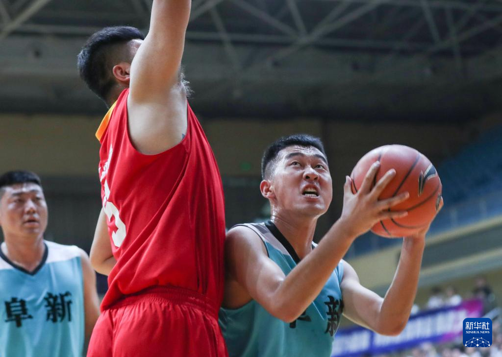 8月8日,彰武縣葦子溝鎮隊球員于純石(右)在開幕式的籃球表演賽中上籃。新華社記者 龍雷 攝pagebreak