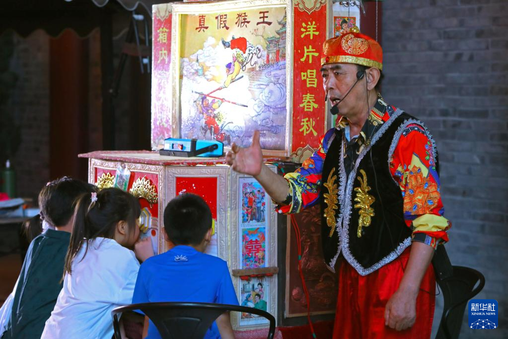 8月10日,小朋友在遼寧省沈陽市和平區老北市旅游休閑街區觀看拉洋片。新華社記者 陳為 攝pagebreak