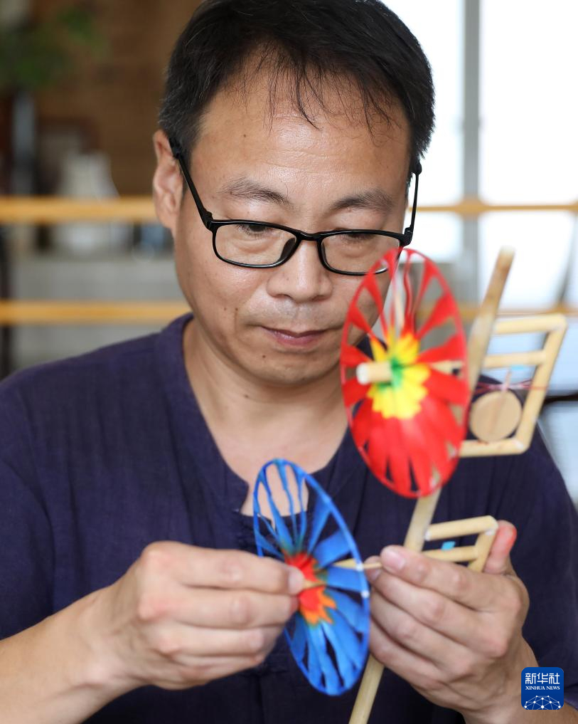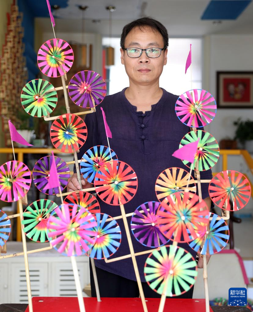 8月17日,崔凱在遼寧省營口市自己家中展示他制作的吉祥輪彩紙風車成品。新華社記者 姚劍鋒 攝