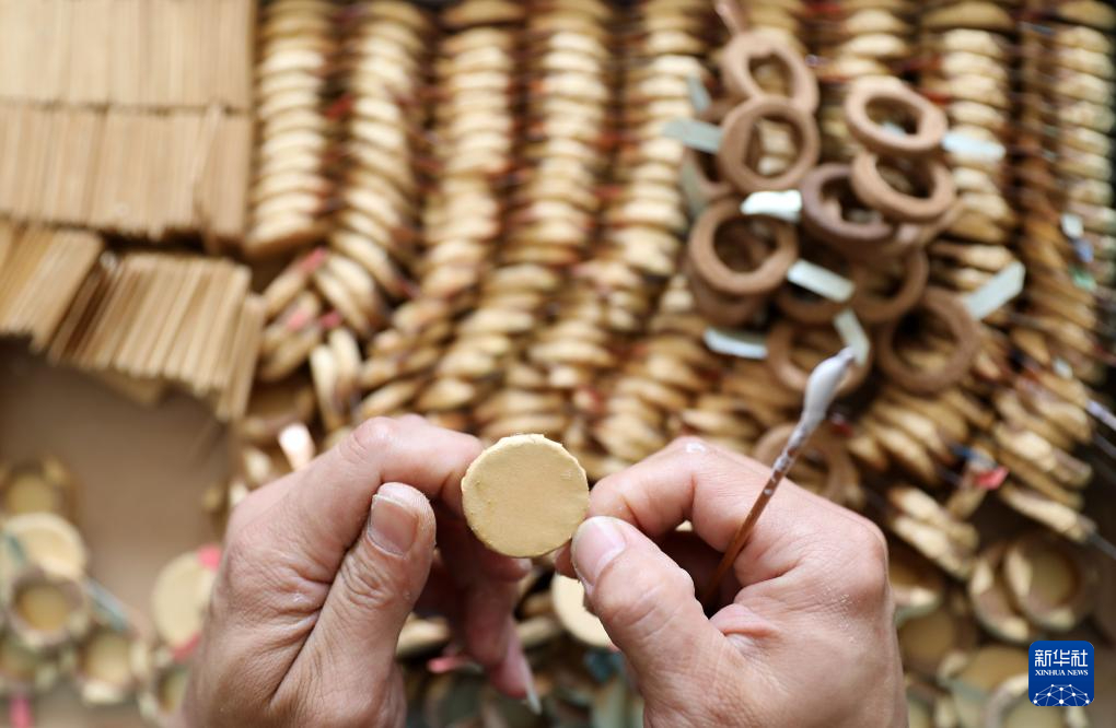 8月17日,崔凱在遼寧省營口市自己家中制作吉祥輪彩紙風車泥鼓。新華社記者 姚劍鋒 攝pagebreak