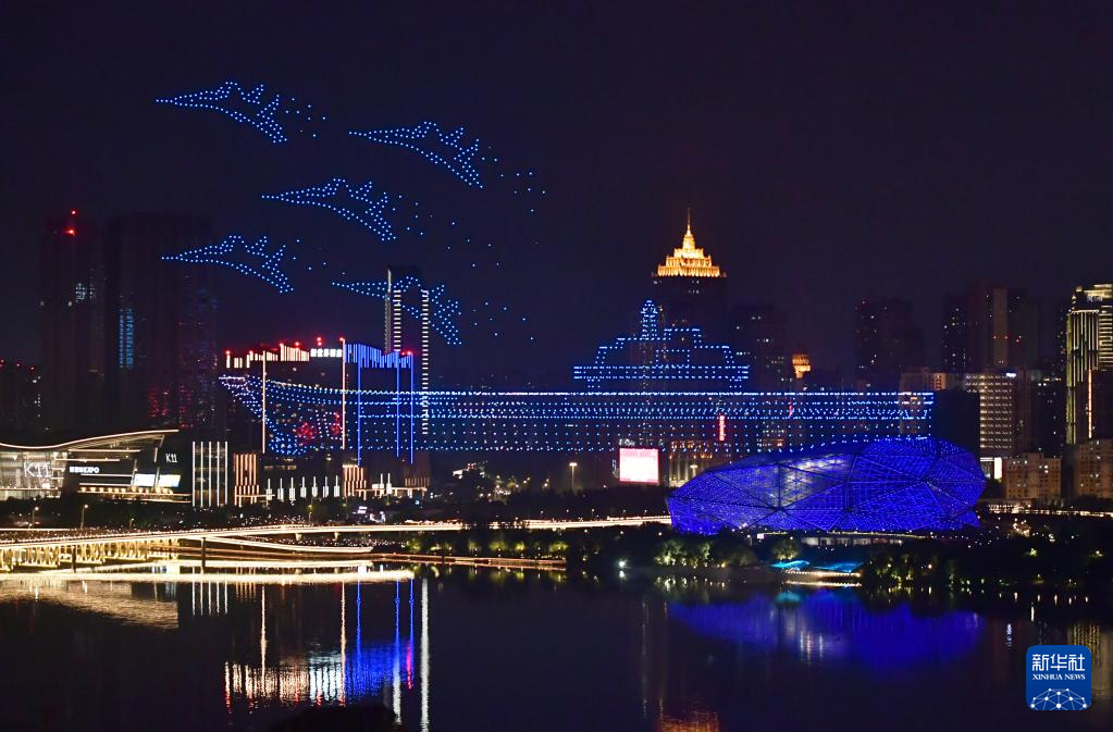 8月17日晚,在沈陽渾河上空區域,2500多架無人機進行矩陣表演,通過矩陣飛行把科技與藝術完美結合,為市民呈現一場閃耀夜空的璀璨光影秀,以動態的立體畫面展示出沈陽在振興發展中的新變化。pagebreak