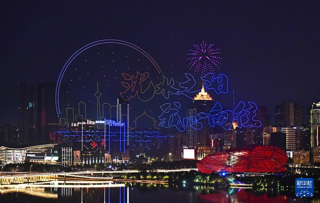 8月17日,在沈陽渾河上空區域,無人機展示“沈水之陽 我心向往”字樣。新華社記者 楊青攝pagebreak
