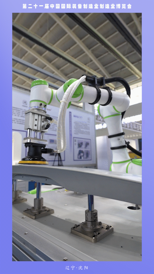 第二十一屆中國國際裝備制造業博覽會上,柔性機械手臂正在磨制零件。新華社發(闞思邈攝)