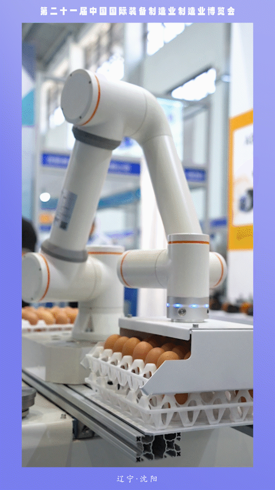 第二十一屆中國國際裝備制造業博覽會上,柔性機械手臂正在裝卸雞蛋。新華社發(闞思邈攝)