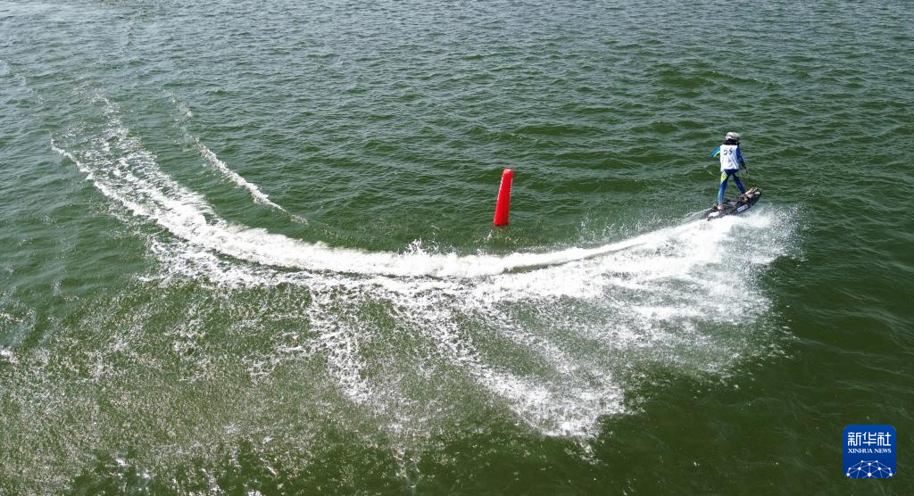 9月16日,金華市芒果體育隊選手馮章豪在專業組公開級:男子動力沖浪板環圈競速賽中(無人機照片)。新華社記者 陳為 攝