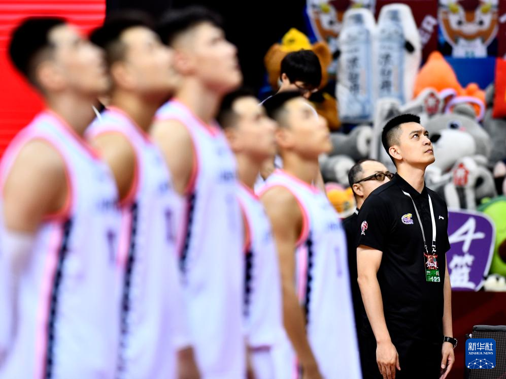2019-2020賽季中國男子籃球職業聯賽(CBA)復賽第二階段(嶗山賽區)比賽期間,楊鳴(右)與遼寧隊隊員在賽前升旗儀式上。新華社記者 郭緒雷 攝