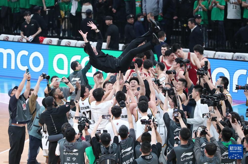 收獲隊史第三座總冠軍獎杯后,遼寧隊球員將楊鳴拋向空中慶祝。新華社記者 龍雷 攝