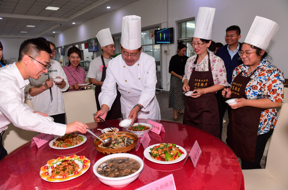 本次美食節以“家鄉味道·沈農情懷”為主題,設置了師生廚藝比賽,全校師生不僅可以品嘗各食堂精心制作的200余種美食,也能參與到美食制作的過程中。經過兩天的激烈角逐,最終由專業評委評選出六組作品獲獎,活動當天在學生一食堂共享廚房制作獲獎作品,并將家鄉美食分享給師生。