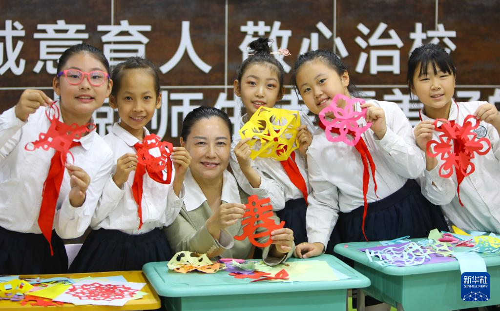 9月22日,孩子們和老師展示豐收節的主題剪紙作品。新華社記者 陳為 攝