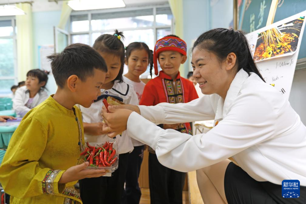 9月22日,老師帶領孩子們“感受豐收的味道”。新華社記者 陳為 攝