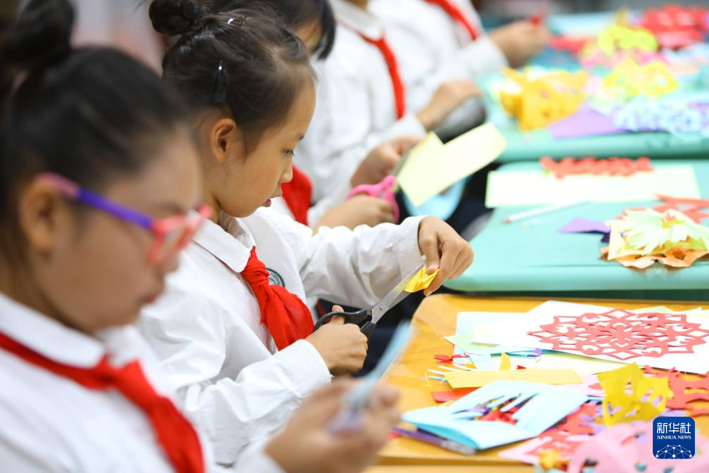 9月22日,孩子們在老師的帶領下創作豐收節的主題剪紙作品。新華社記者 陳為 攝pagebreak