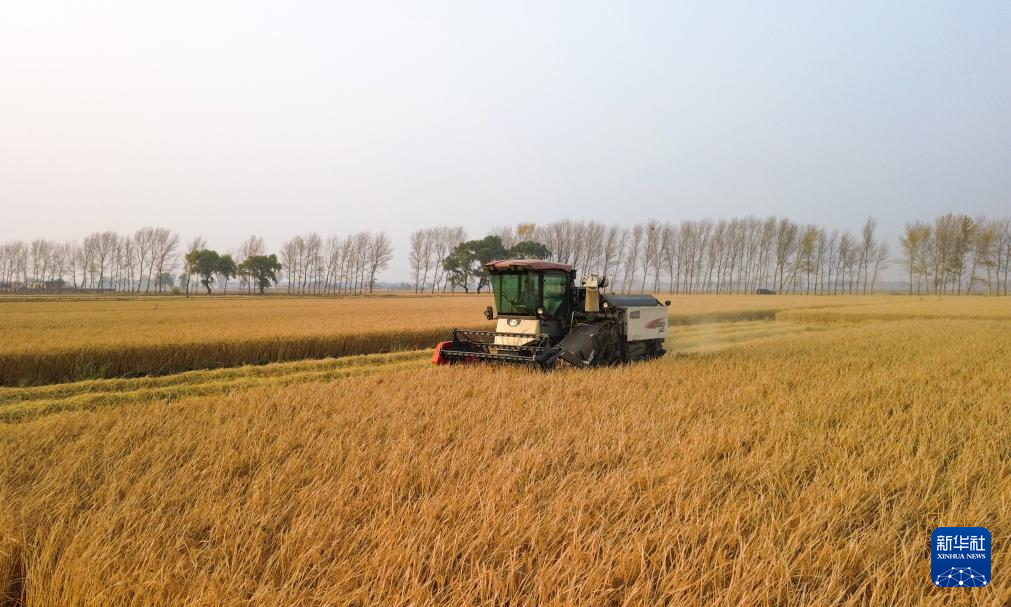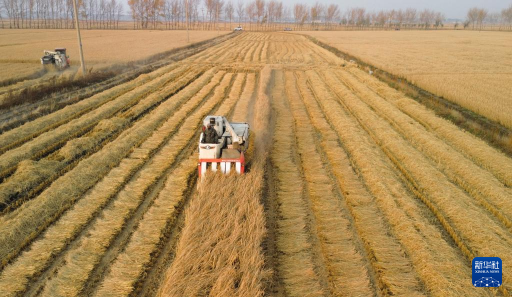 10月25日,收割機在沈陽市沈北新區張家村的稻田中收割水稻(無人機照片)。新華社記者 陳為 攝