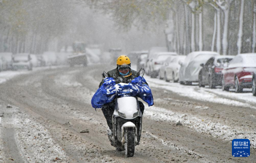 11月6日,在沈陽市渾南區,快遞員在雪中送快遞。新華社記者 楊青 攝