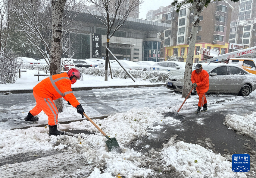11月6日,在沈陽市大東區街頭,環衛工人正在進行清雪作業。(沈陽大東中環潔市容環境服務有限公司供圖)