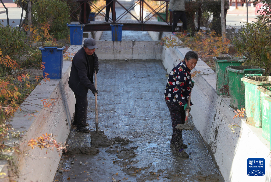 10月31日,官營子村村民在住宅區清理水塘。新華社記者龍雷攝pagebreak