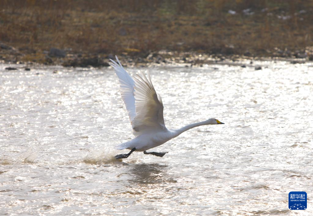 11月21日,天鵝在北票市八家子鄉紅村天鵝灣嬉戲覓食。新華社記者 陳為 攝pagebreak