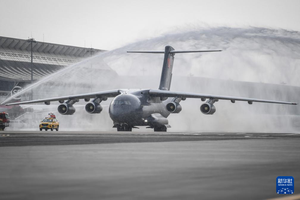 11月23日,在沈陽桃仙國際機場,運送志愿軍烈士遺骸的空軍專機通過水門。新華社記者 潘昱龍 攝pagebreak