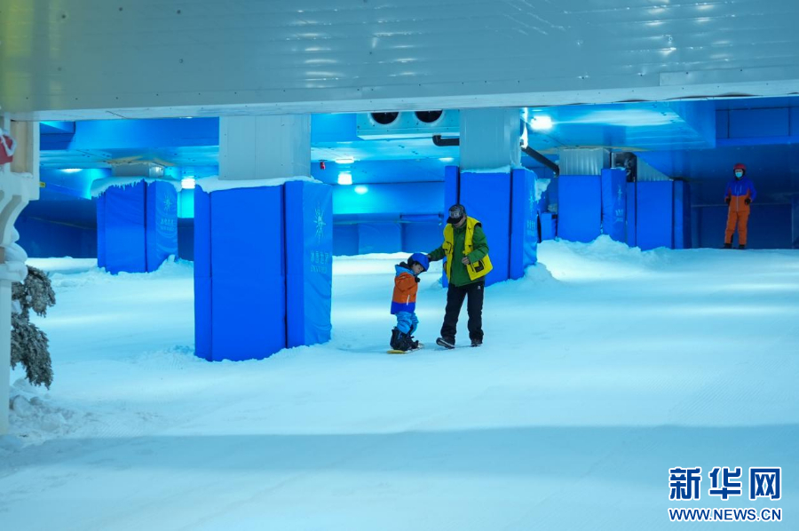 圖為在沈陽龍之夢龍悅冰雪世界室內滑雪場,一名小朋友在教練的陪同下體驗滑雪。新華網許志康攝