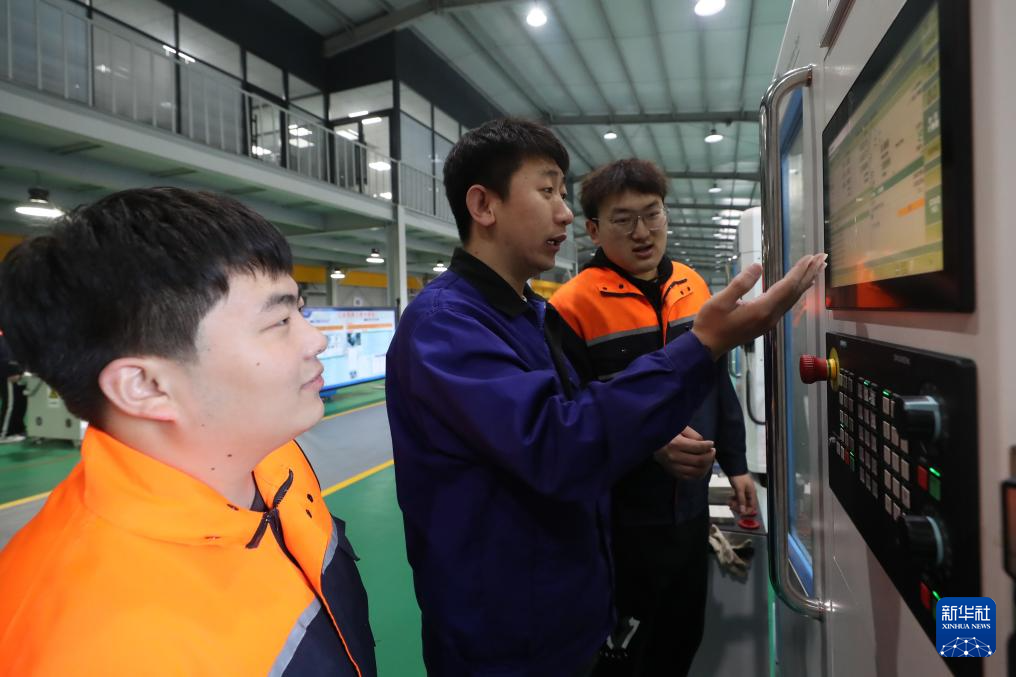 12月6日,沈工-華中數控“一帶一路”訂單班同學在老師指導下操作數控五軸加工中心。新華社記者 楊青 攝