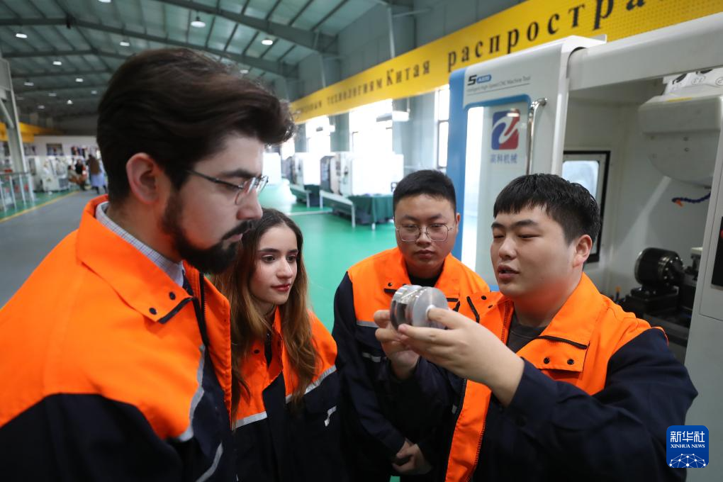 12月6日,沈工-華中數控“一帶一路”訂單班同學為俄羅斯伊爾庫茨克國立大學的留學生講解數控五軸加工中心操作經驗。新華社記者 楊青 攝