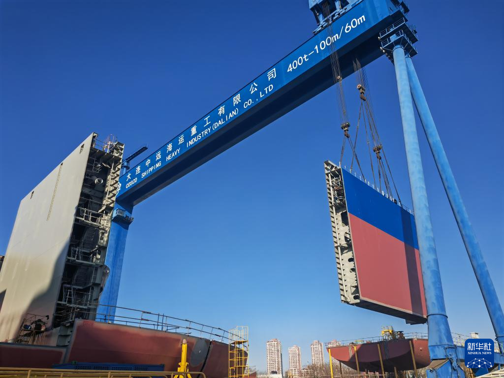 1日,大連中遠海運重工有限公司的龍門吊正在吊裝船舶構件。新華社記者郭翔 攝